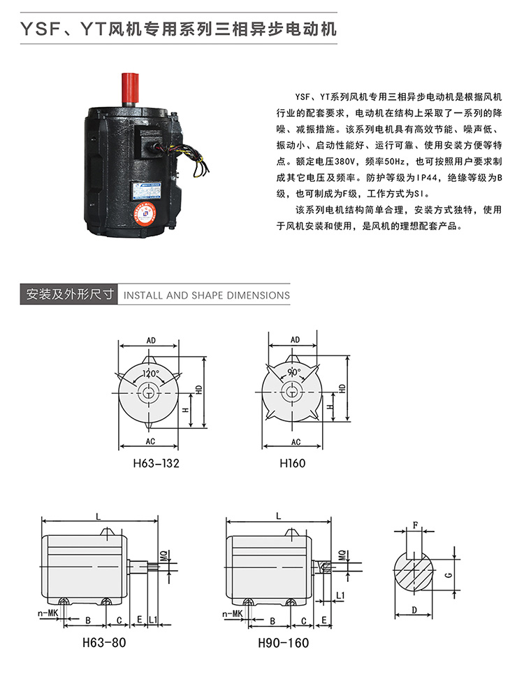 YT系列風(fēng)機(jī)專用三相異步電動機(jī)是根據(jù)風(fēng)機(jī)行業(yè)的配套要求,電動機(jī)在結(jié)構(gòu)上采取了一系列的降噪、減振措施。該系列電機(jī)具有高效節(jié)能、噪聲低、振動小、起動性能好、運(yùn)行可靠、使用安裝方便等特點(diǎn)。額定電壓380V、頻率50HZ,也可按用戶要求制成其它電壓及頻率。防護(hù)等級為IP44,絕緣等級為B級,也可制為F級,工作方式為S1。 該系列電機(jī)結(jié)構(gòu)簡單合理,安裝方式好,適用于風(fēng)機(jī)安裝和使用,是風(fēng)機(jī)的理想配套產(chǎn)品。