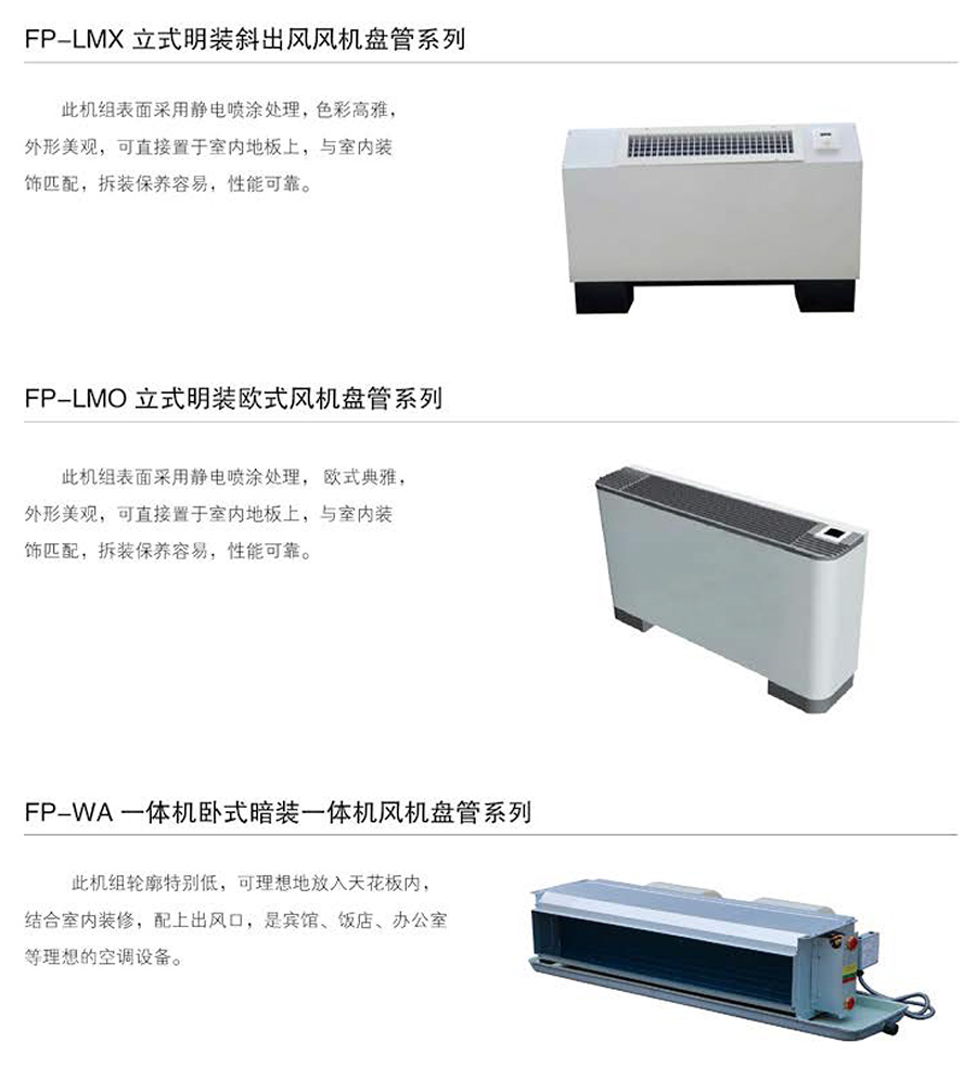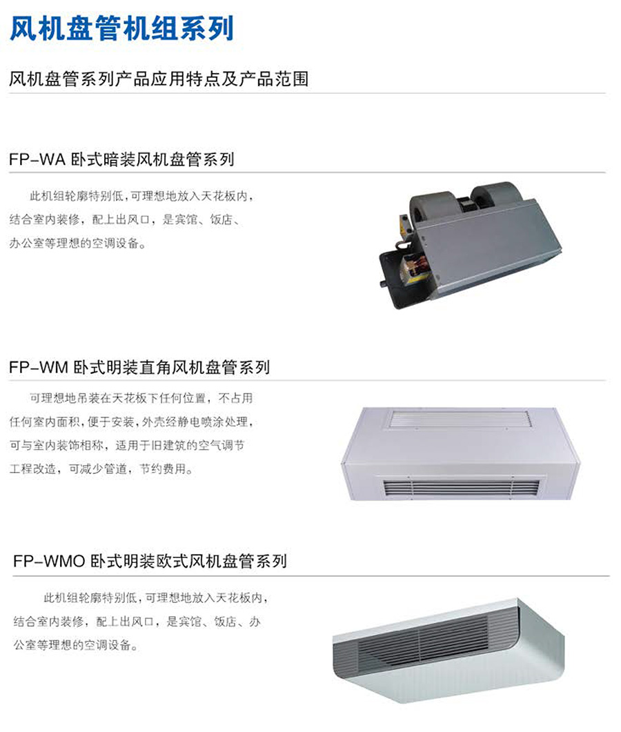 風(fēng)機盤管機組主要由風(fēng)機、熱交換器(盤管)、凝水盤、殼體及控制器組成,它適用于集中式空調(diào)系統(tǒng)。設(shè)計先進、品種齊全、性能優(yōu)越,用途廣泛,通常用于要求噪聲小,溫度調(diào)節(jié)靈活的各種賓館、公寓、飯店、醫(yī)院、商業(yè)大樓等。