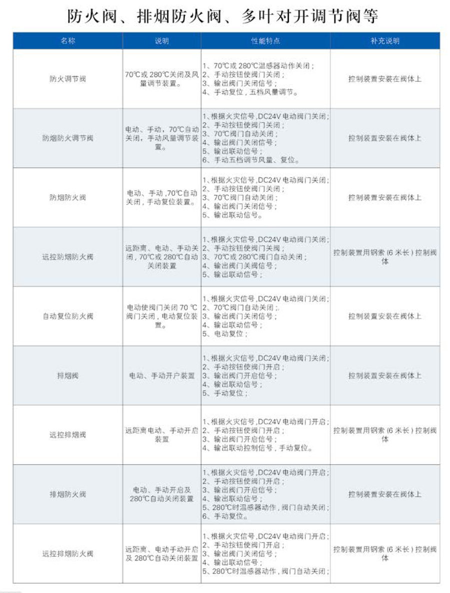 通常分為常開電動式、常開手動式、常閉電動式三種,均可輸出關(guān)閉電信號及啟動連鎖,熔斷關(guān)閉溫度均為280℃,風閥均可調(diào)節(jié)開度。