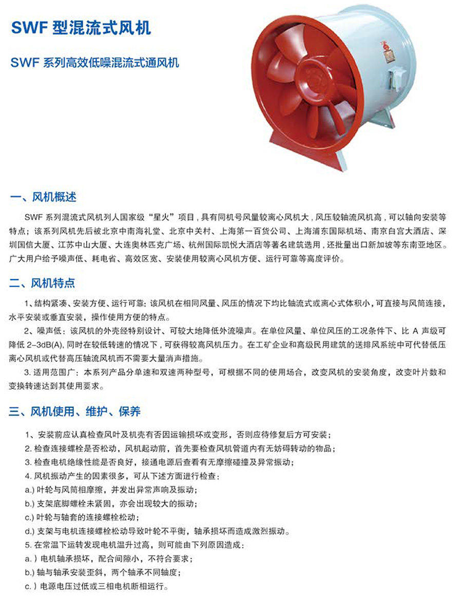 【SWF(B)】系列低噪節(jié)能混流通風(fēng)機(jī)是介于軸流式和離心式通風(fēng)機(jī)之間的一種新型風(fēng)機(jī),具有離心式風(fēng)機(jī)的高壓力,軸流風(fēng)機(jī)的大流量,效率高,節(jié)能好,噪聲低,安裝方便等特點(diǎn)。風(fēng)機(jī)設(shè)計(jì)新穎,結(jié)構(gòu)緊湊,體積小,重量輕,易安裝,風(fēng)機(jī)可聯(lián)接管道和安裝在空調(diào)箱內(nèi)。低壓離心風(fēng)機(jī),廣泛用于工業(yè),民用建筑通風(fēng)除塵等。HL3-2A系列混流通風(fēng)機(jī)廣泛用于隧道、地下車(chē)庫(kù)、高級(jí)民用建筑、冶金、廠礦等場(chǎng)所的通風(fēng)換氣及消防高溫排煙,特殊環(huán)境可選用防爆型混流風(fēng)機(jī)。